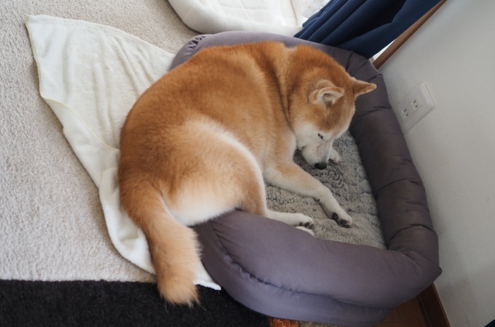 シニア犬貫太、ベッドから少しはみ出しちゃうことは時々あったけど、この日は、完全に・・・