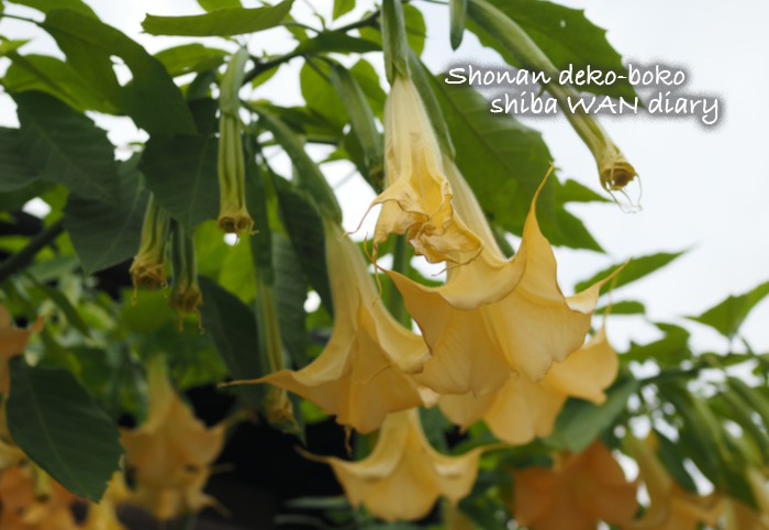 母屋のエンゼルトランペットが満開です。大ぶりの黄色い花と、ほんのり甘い香りが気分・・・