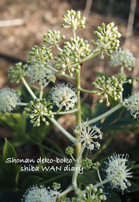 母屋の八手の花です。ごっつい葉っぱの割に、花は可愛らしい♡さて、少し前の夜の貫太・・・